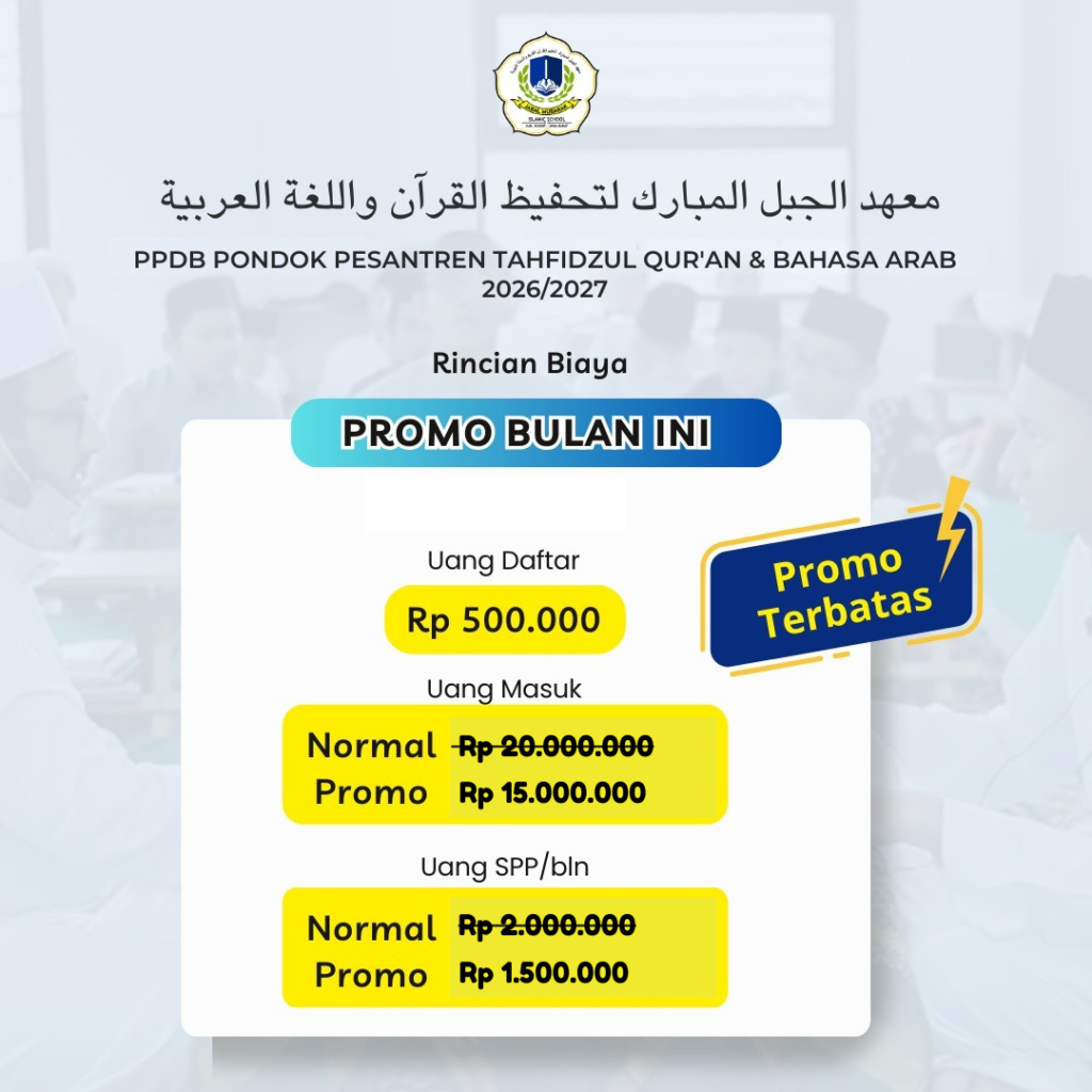 Jabal Mubarak Islamic Boarding School menghadirkan pendidikan Islam berasrama dengan program Tahfidzul Al-Qur’an 30 Juz, penguatan Bahasa Arab dan Inggris, serta pembinaan entrepreneurship melalui unggulan Digital Marketing.